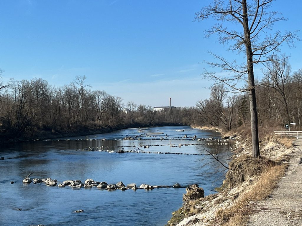 An der Isar gehts entlang, deren immer ruhigerer Lauf – schließlich ist sie hier längst den Bergen entronnen – ab und an durch Wehre genannte Stufen mit Felseinwürfen künstlich in Unruhe versetzt wird:
