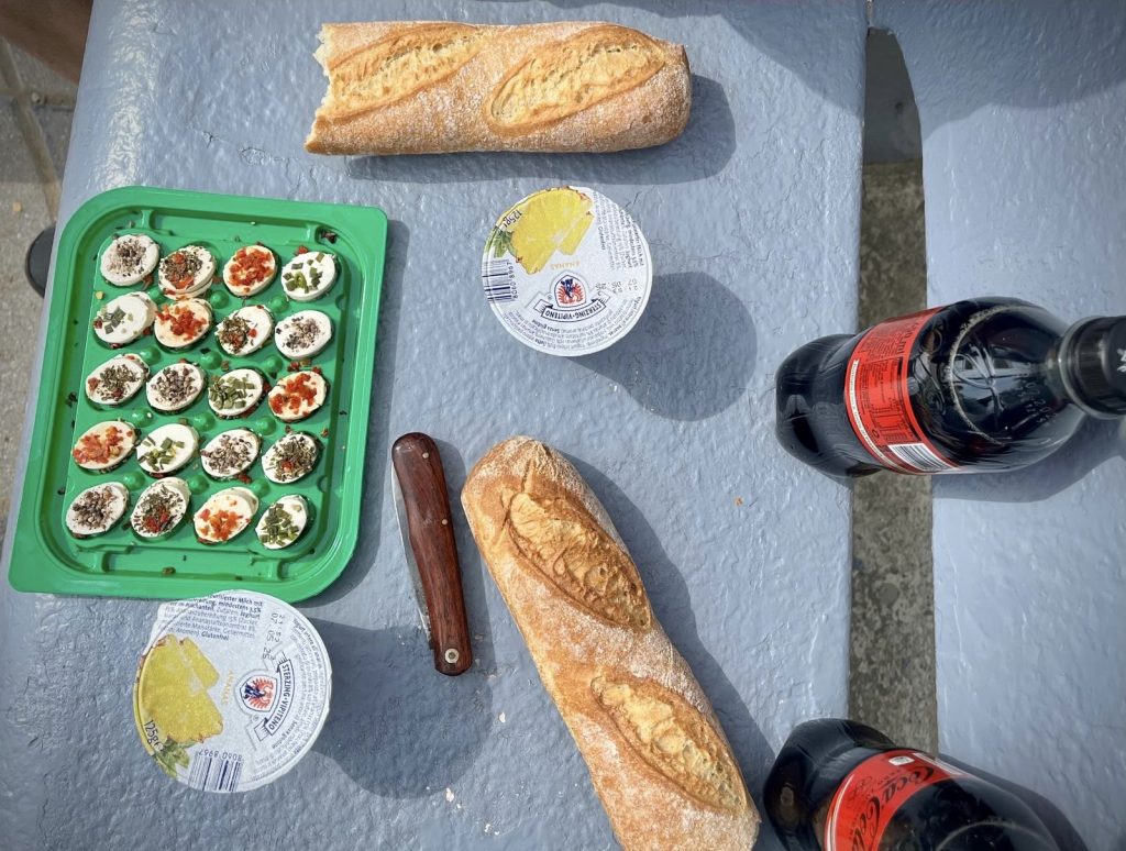 Wir haben uns schon im coop eingedeckt und genießen das erreichte Ziel kulinarisch auf einer Bank am Strand.