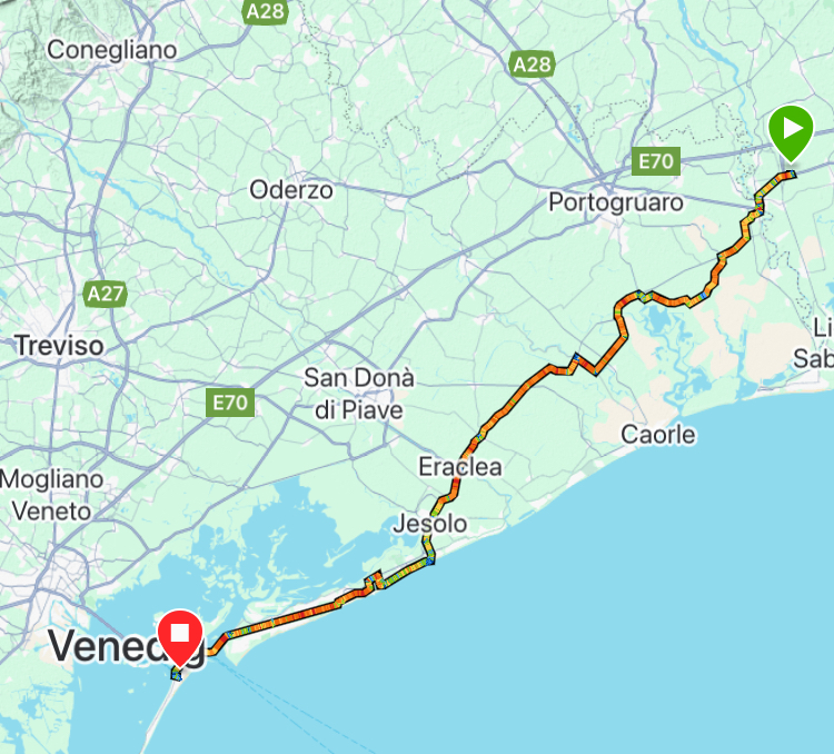 Jetzt sind wir schon mehr als eine Woche unterwegs und heute ist es soweit: Wir werden das Mittelmeer erreichen – das Quartier auf dem Lido von Venedig ist schon gebucht. Aber dazu sind noch rund 60 km bis Jesulo zu bewältigen. Das an dieser Stelle sonst gern gezeigte Höhenprofil werden wir Euch allerdings von heute an bis Griechenland ersparen: Es ist flach wie mit dem Lineal gezeichnet.