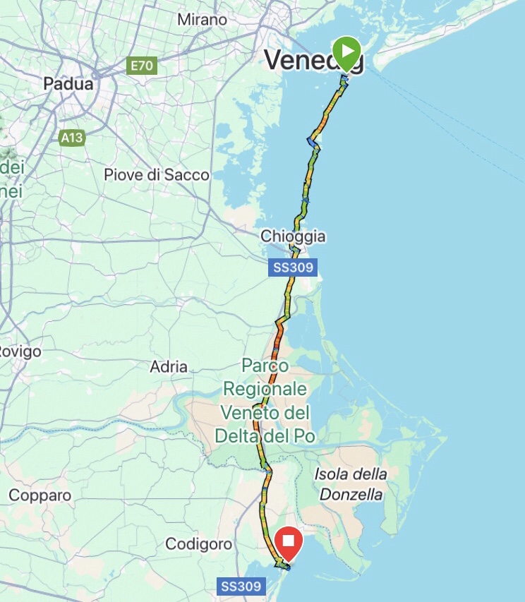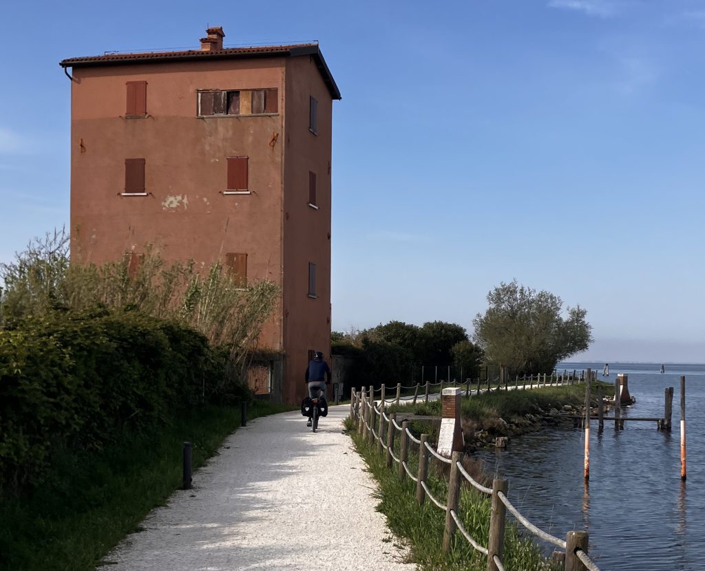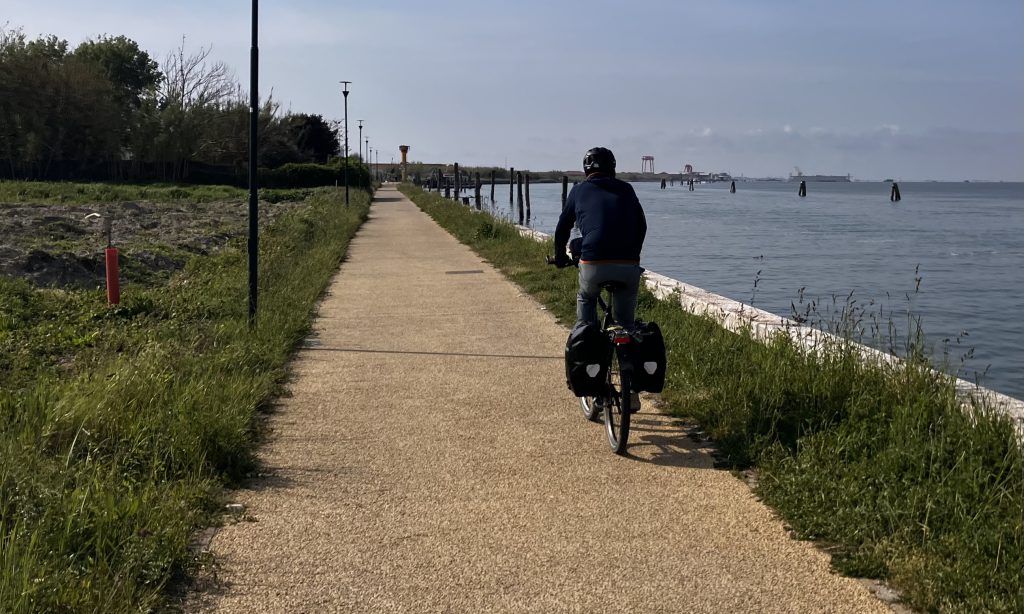 Neun Tage hat’s gedauert bis Venedig erreicht war. Aber die Zeit steht nicht still: schon sitzen wir in unserem Hotel auf dem Lido am Frühstückstisch und nehmen den zweiten Americano. Dann werden die Räder aufgeschlossen und bepackt und schnurr geht die Reise weiter. Ziel heute ist über den Lido wieder ans Festland und durch die Poebene.