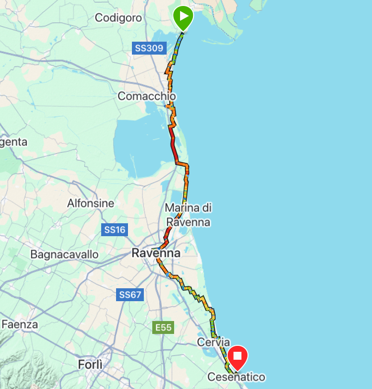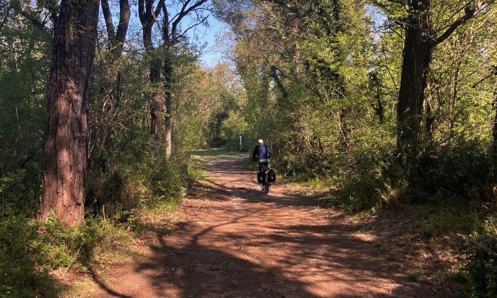 Dann geht es aber schnell weiter. Unser nächstes Quartier in Cesenatico ist schon gebucht und das ist ja nur ein kleiner Hopps bis dort hin … denken wir. Aber am Ende des Tages werden es doch wieder 100 km, davon viele Kilometer mit Gegenwind und holprigen Waldwegen, wo man jede unbeachtete Wurzel mit dem Allerwertesten spürt.