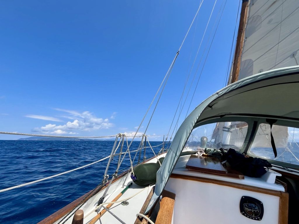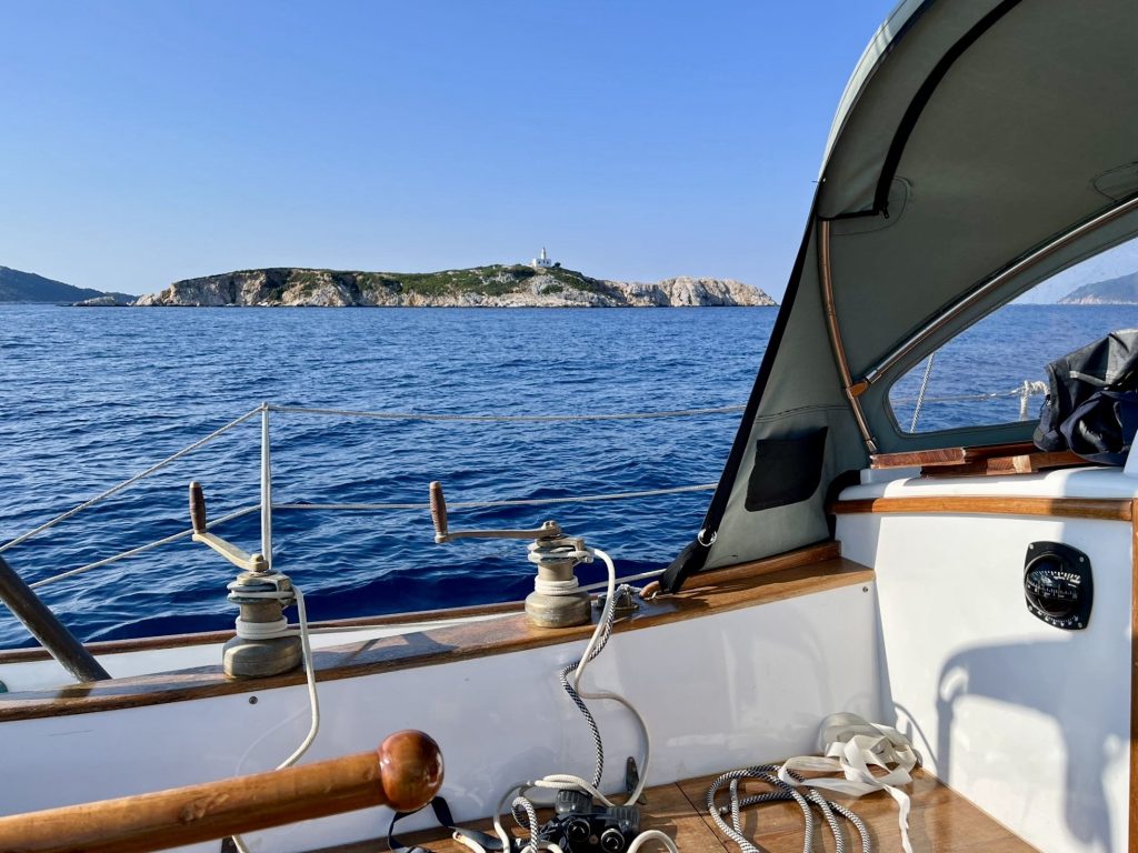 Eine leichte Mittagsbriese setzt ein. Ich mache Schluss mit Ärgern, lege ab und segle nach Skopelos. Das Wetter ist mittlerweile wunderschön geworden, und so wird es doch noch ein richtig schöner Segeltag.