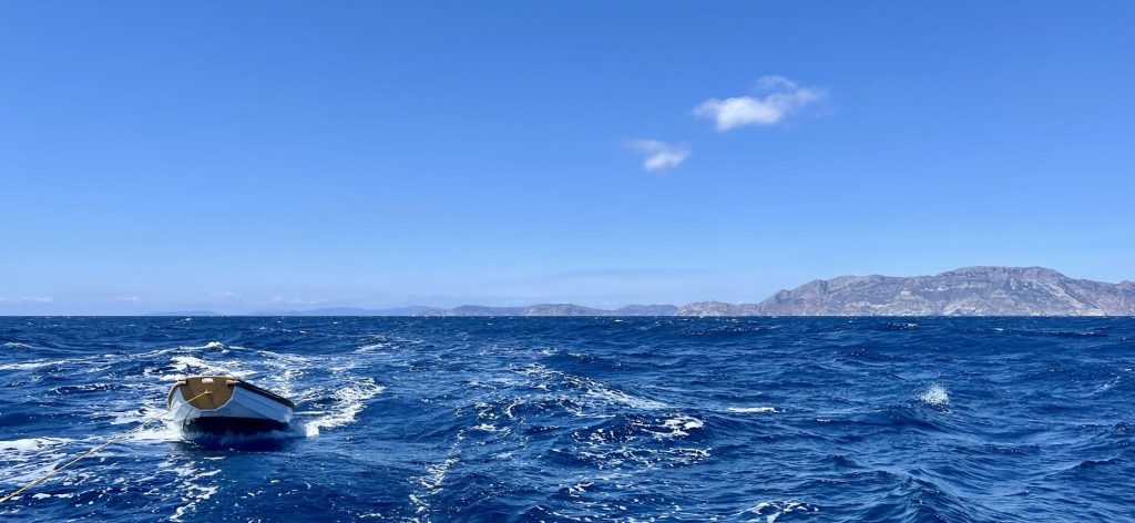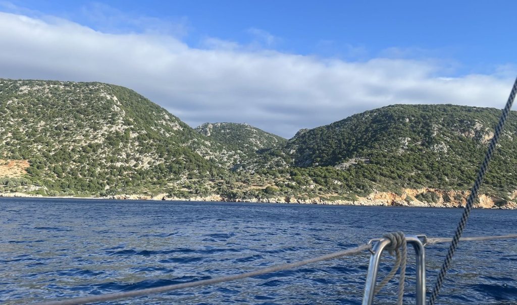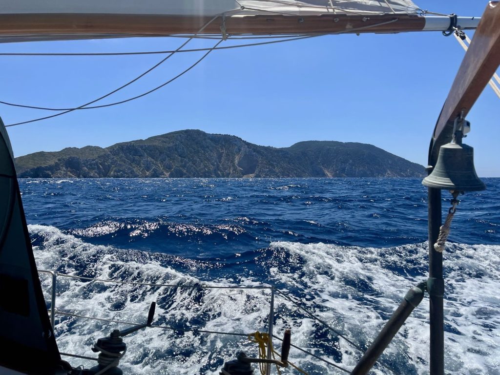 Zwischen den beiden Inseln Alonissos und Peristera pfeift es ordentlich, katabatische Winde stürzen sich von den Bergen runter aufs Meer und drücken die Nostsos auf die Seite. Draußen angekommen ist aber erst mal Enttäuschung: Vom versprochenen Wind ist nichts zu sehen. Wie ich mich aber von der Insel löse springt der Wind plötzlich an und ich habe herrliche 17 Knoten aus Nord, genau wie angesagt. Was jetzt folgt ist Champagnersegeln. Mit 6-7 Knoten Fahrt geht’s bei aufreißendem Himmel durchs Wasser, halber bis achterlicher Wind, Rauschefahrt vom Feinsten. Was ein Unterschied zu den letzten Tagen!