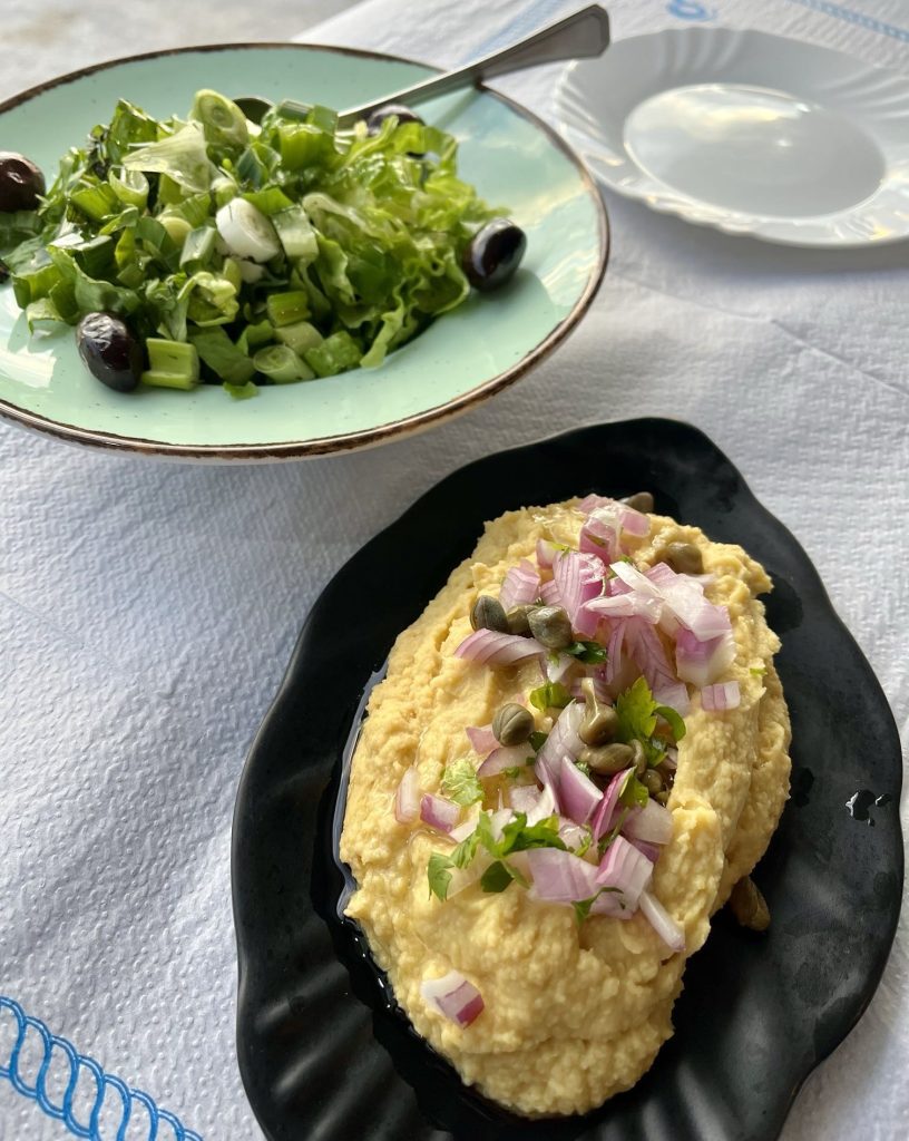 Das erste Gefühl: Hier ist das Ende der Welt. Ich gehe ins einzige Restaurant der Insel und esse Fava, Püree aus gelbe Spalterbsen, sehr fein.