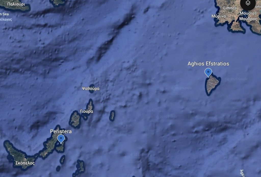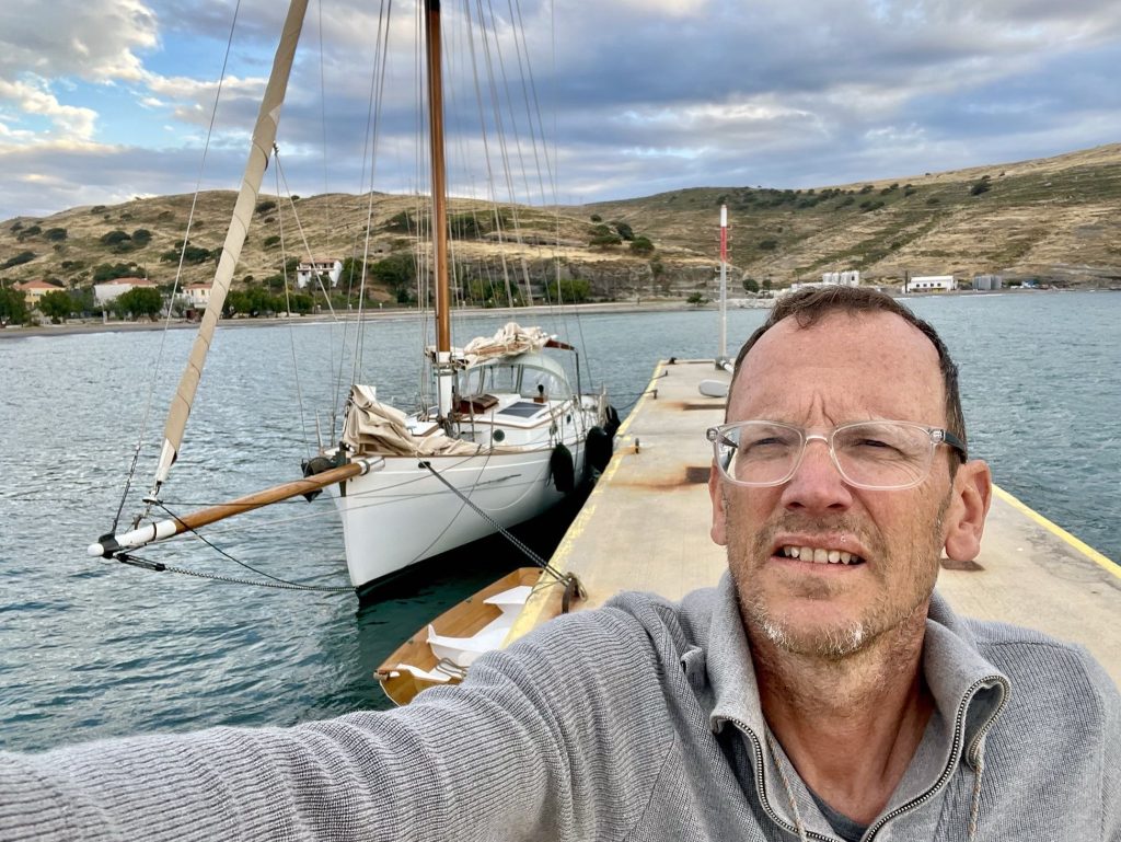 Leider wird der Wind dann gegen Nachmittag schwächer wie vorhergesagt. Die Brise geht, der Schwell bleibt, und so findet der Rest der Fahrt dann leider unter Maschine statt, und ordentlich durchschaukeln tut’s mich natürlich auch. Ich bin dann froh als ich Abends gegen sechs in Agios Efstratios ankomme. Im kleinen Hafen gibt es nur 3 Plätze für Segelboote, alle sind frei. Ein Fischer hilft mit beim längs anlegen, dann bin ich da.