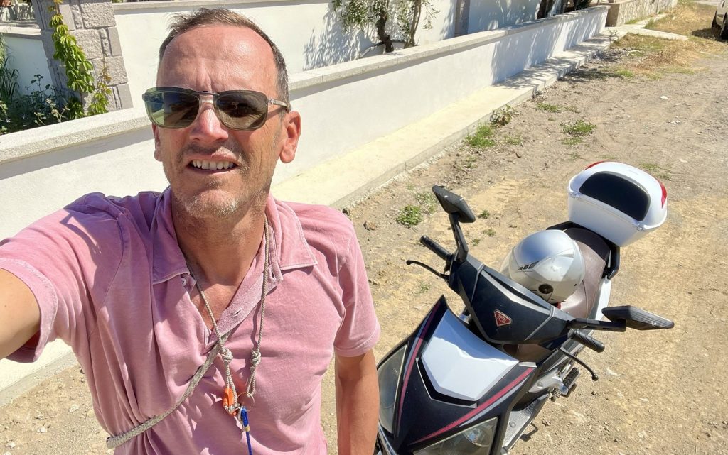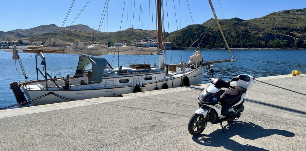 Wie ist denn jetzt Limnos? Um das rauszufindenden bestelle ich mir einen Roller in das Reisebüro am Hafen. Der Roller kommt, oder besser gesagt, Theodoros kommt, der Besitzer des Mopedverleihs und nimmt mich auf seinem Roller mit in sein Geschäft zum Ausfüllen der Formalitäten. Theodoras ist eine Seele von Mensch und erzählt mir beim Ausfüllen des Leihvertrsgd von seiner Leidenschaft: Er ist Sänger und spielt mir gleich eines seiner Lieder vor. Ich finde er ist ein wirklich toller Sänger!