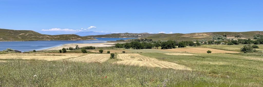 2. Limnos ist zum allergrößten Teil flach. Weite Wiesen- und Äcker, jetzt im Mai schon in Teilen gelb, in einer sanft hügligen Landschaft prägen das Bild. Kilometer um Kilometer fahre ich durch nach Heu und Blumen duftendes Land. Zum Meer hin läuft das Land flach aus, große Marschflächen und tiefe, lange Strände mit flachem Wasser sind typisch.