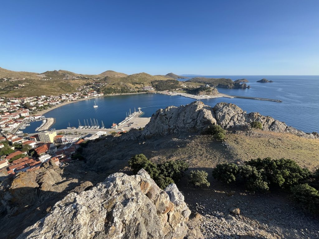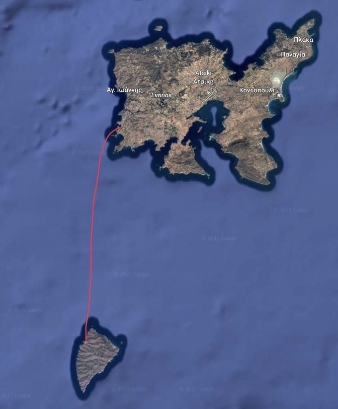 Also mach ich mich startklar. Der Tag ist srahlend blau, kaum Wind. Ich lege ab, zieh das Großsegel als Stützsegel auf – wirkt Wunder gegen den immer noch vorhandenen Schwell – und tuckere ganz gemütlich über die blaue See in Richtung Limnos. Es sind nur 20 Seemeilen bis Limnos, also etwa 4 Stunden – Zeit, die ich mir mit Lesen und einigen kleineren Arbeiten am Boot vertreibe.