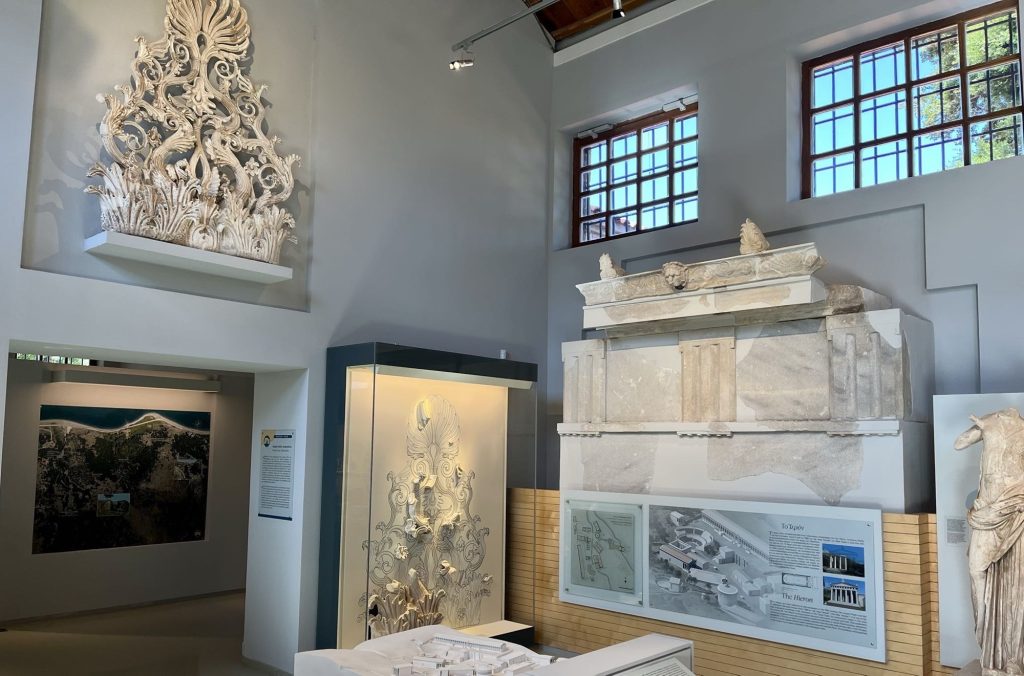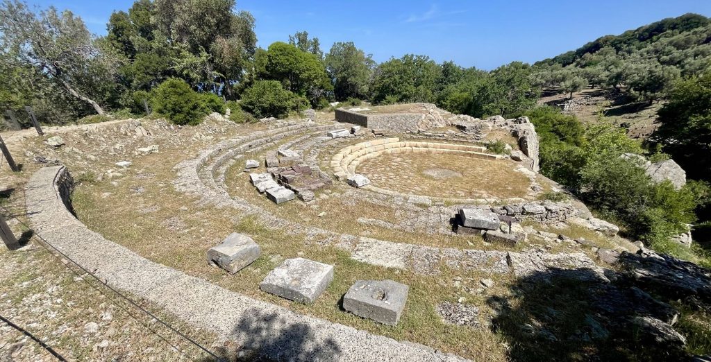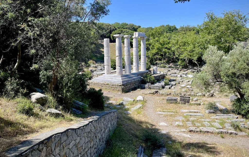 Am nächsten Morgen heißt’s dann rauf aufs Moped zur Inselbesichtigung. Auf dem Programm steht natürlich das „Heiligtum der großen Götter“, die ausgegrabene Tempelanlage und Hauptattraktion der Insel. Meine Erwartungen sind nicht sonderlich hoch, aber was ich dort zu sehen bekomme überrascht und begeistert mich vollständig. Zunächst geht’s in das kleine aber sehr feine Museum, in dem die am Ort gefundenen Artefakte ausgestellt und dokumentiert sind: Phantastische Keramik und Schmuck, dazu gibt’s einen Überblick über die Gesamtanlage, die man anschließend begehen kann.