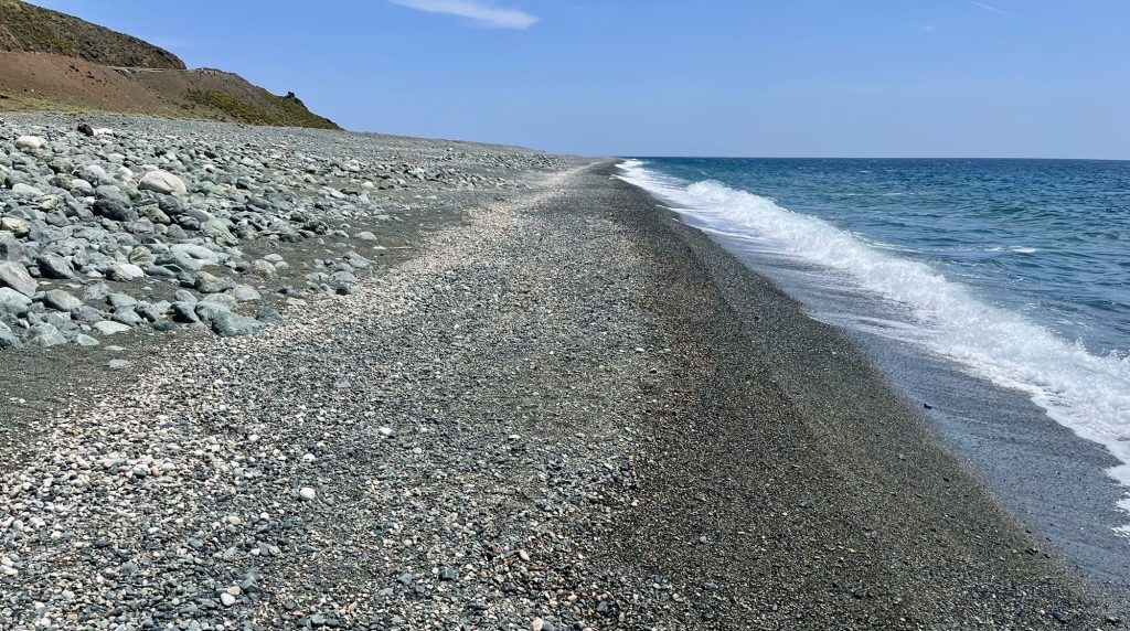 Die Strände der Insel sind speziell. Statt Sand gibt‘s Kies, der wegen des vulkanischen Ursprungs schwarz-grün gefärbt ist.