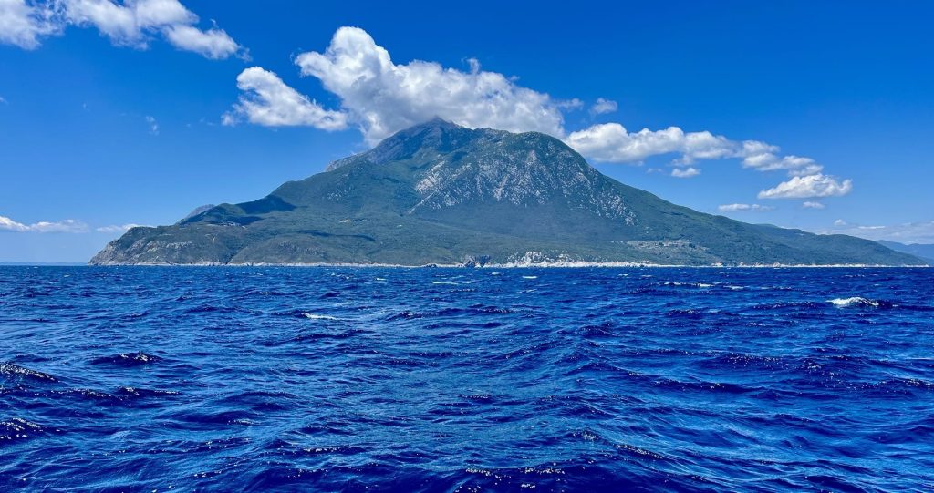 Beeindruckend ist der Athos auch aus der Nähe, wie er so aus dem Meer aufsteigt, und immer wolkenumkränzt.