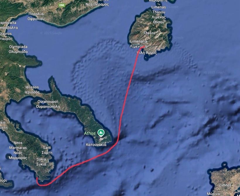 Nachdem im ersten Teil der Strecke mir noch starke Wellen bei schwachem Wind das Leben schwer gemacht haben wird die See bei der Athos Umrundung plötzlich glatt und eine schöne Brise zieht mich um das Kap.