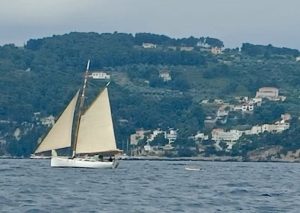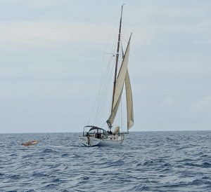 Am nächsten Morgen breche ich früh auf. Der Wind soll den Tag über wie gestern schon kräftig aus Nord blasen, den will ich nutzen um in Richtung Festland voranzukommen. Auf dem Wasser begleitet mich über weite Strecken mein neuer Segelerfreund Luca, der mir auch gleich 2 Fotos von meinem Boot schickt: