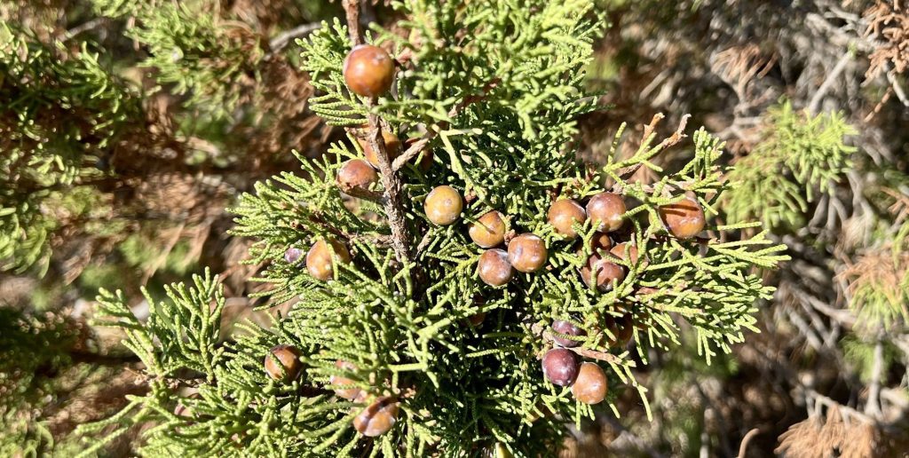 und beginne den Aufstieg. Noch ist es erst 9 Uhr, aber es ist eine Hitze wie im Backofen. Statt auf einem Pfad zu wandern sucht man sich seinen Weg durch die Natur, an den Wachholderbüschen vorbei und passt auf, nicht zu sehr zerkratzt zu werden.
