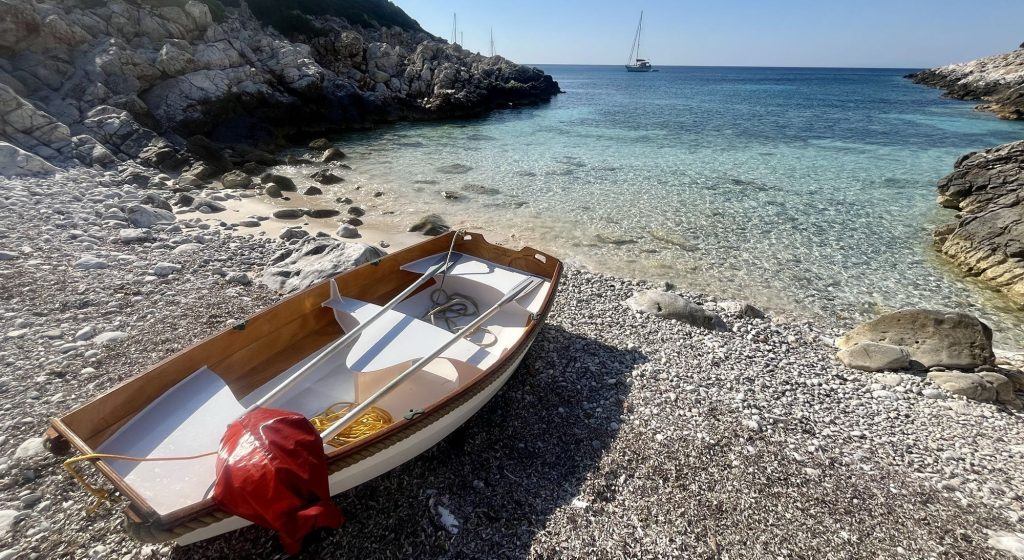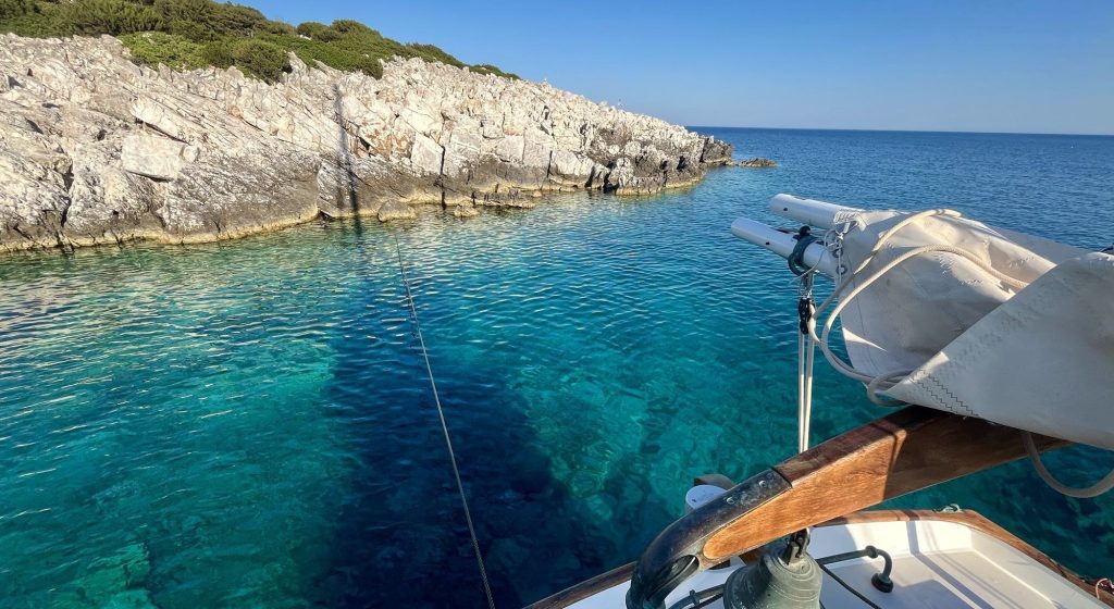 Im Süden, auf der der Hauptwindrichtung abgewandten Seite, gibt es eine hübsche Ankerbucht, in der ich heute Nacht bleiben möchte. Ich ankere auf 5 Meter Wassertiefe und mache mich mit einer Landleine am Ufer fest. Das Wasser ist phänomenal.