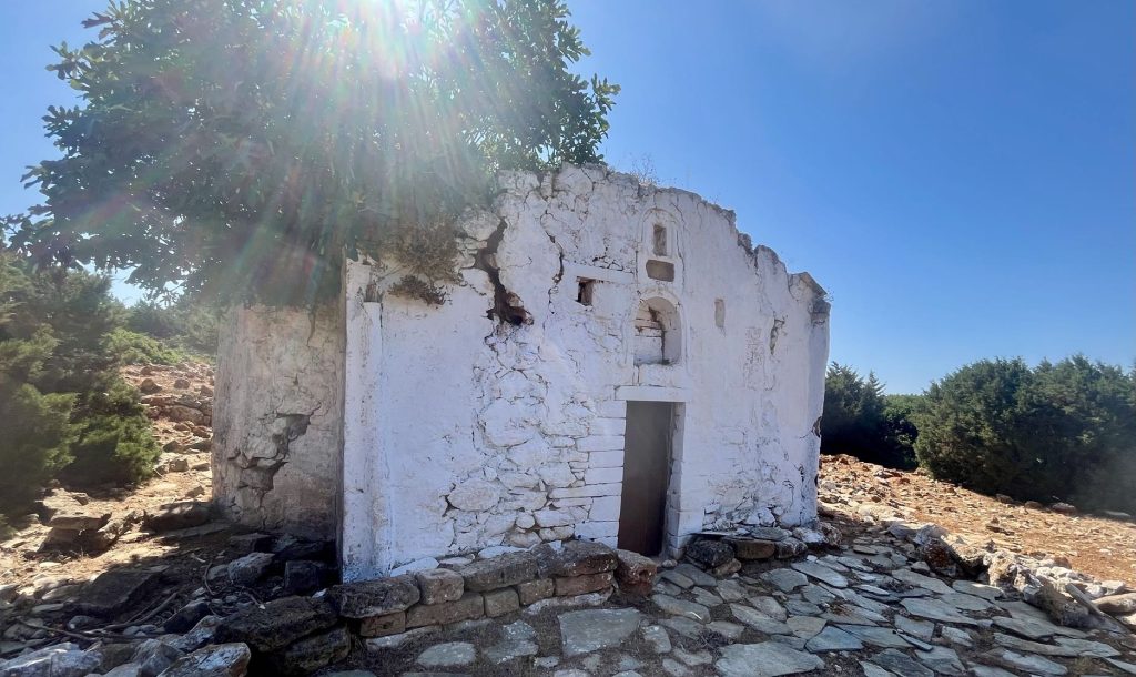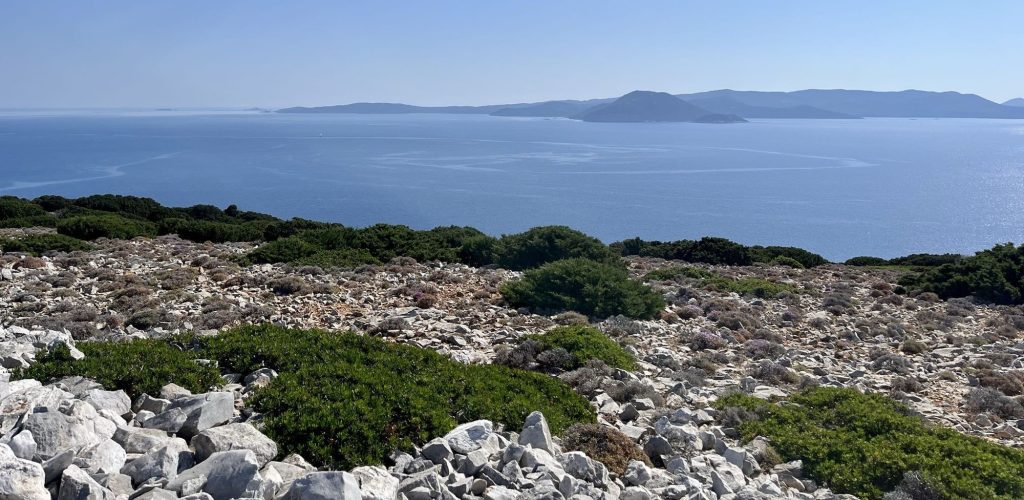 Nach einer dreiviertel Stunde komme ich an der höchsten Stelle der Insel an. Von einer Kirche ist nichts zu sehen, aber die Aussicht hinüber nach Skyros ist toll.