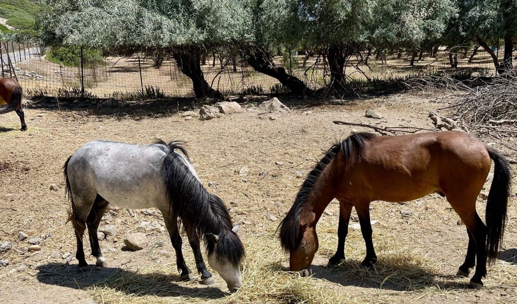 Auf dem Weg nach Norden komme ich an einer weiteren Berühmtheit der Insel vorbei: Den Pferdchen von Skyros. Dabei handelt es ich um eine uralte, autochthone Pferderasse, die es ursprünglich nur in Skyros gab. Angepasst an die kargen Verhältnisse auf der Insel werden sie nur knapp über einem Meter im Stockmass hoch und sind nach Aussage der Pferdepflegerin, mit der ich gesprochen habe, sanft, ausdauernd und sehr genügsam. Müssen sie wohl auch sein, wenn ich mir die Insel so anschaue.