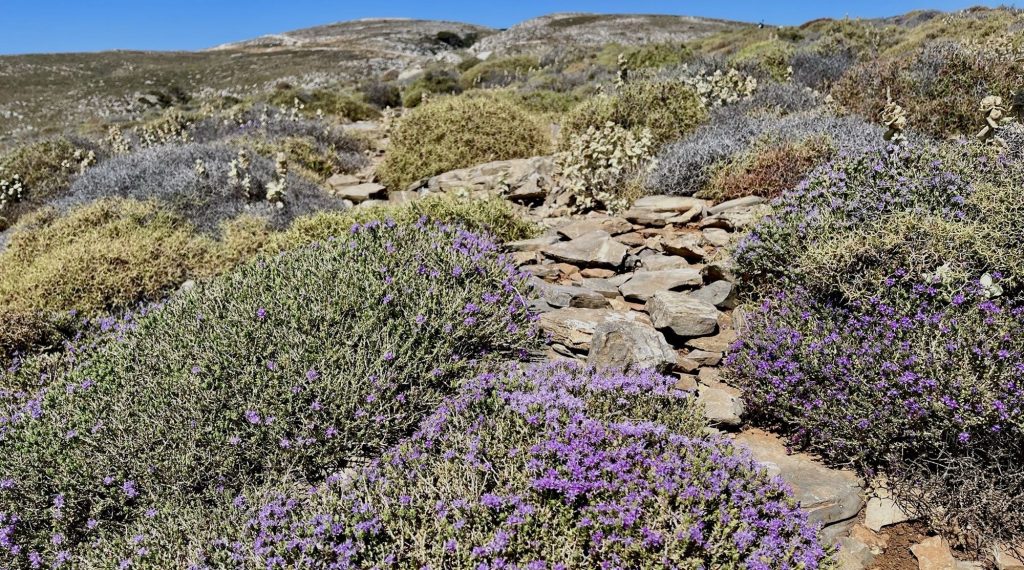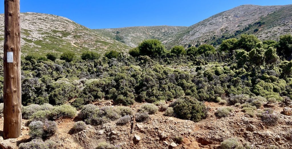 Also aus dem Hafen raus und Richtung Süden. Skyros, wie viele Inseln mit einer Hauptwindrichtung, hat zwei ganz unterschiedliche klimatische Zonen. Hier ist es der Süden, der trocken, fast wüstenhaft ist. Karge Felsenlandschaften, keine Bäume, nur kniehohe Dornen und Gestrüpp, das unter dem Verbiss der allgegenwärtigen Ziegen seltsame Formen annimmt.