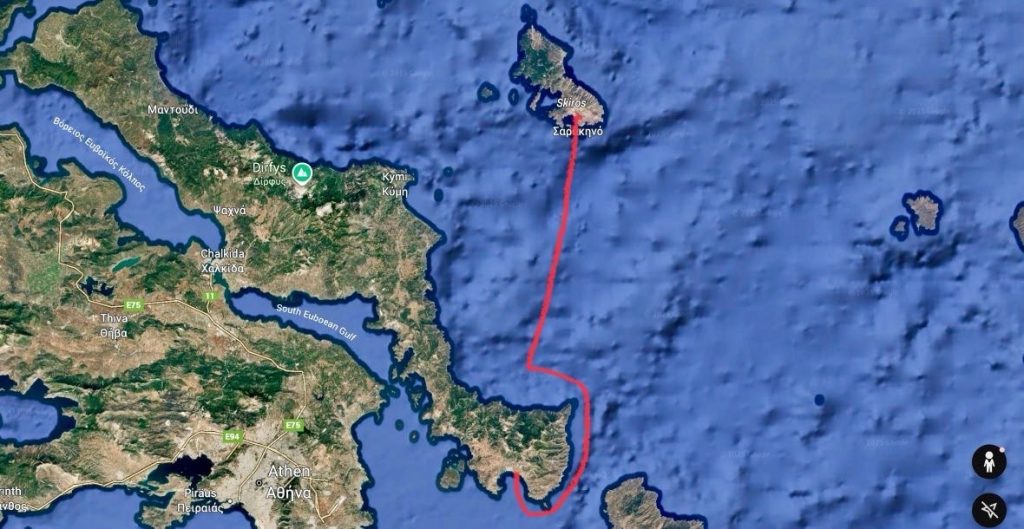 Den Reisetag habe ich mir gut ausgesucht und dafür 2 ungeplante Mehrtage in Skyros verbracht. Heute soll der Wind nur mäßig und in meine Reiserichtung wehen. Und so geht’s auch tatsächlich ruhig los. Den kleinen Golf von Skyros verlasse ich unter Maschine bei fast Windstille,