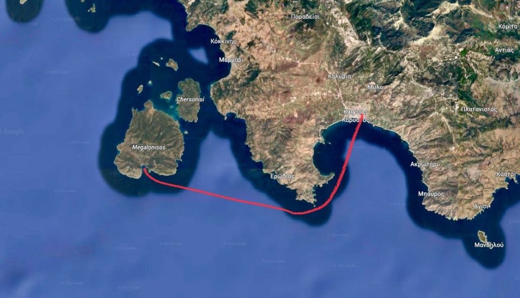 Eine Halse bringt mich vor das Kap Kavo Doro, mit einer zweiten Halse biege ich in die Passage zwischen Euböa und Andros ein.