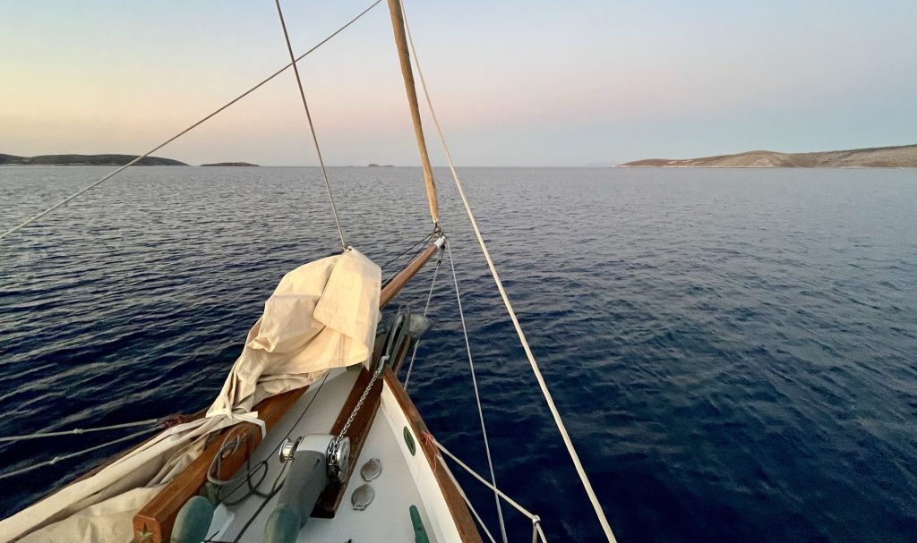 und erst mit Sonnenaufgang legt der Wind zu, 12 – 14 Knoten aus Nordost, wie vorhergesagt. Ich habe – sicher ist sicher – ein Reff in das Großsegel eingebunden und laufe komfortabel auf Euböa zu.