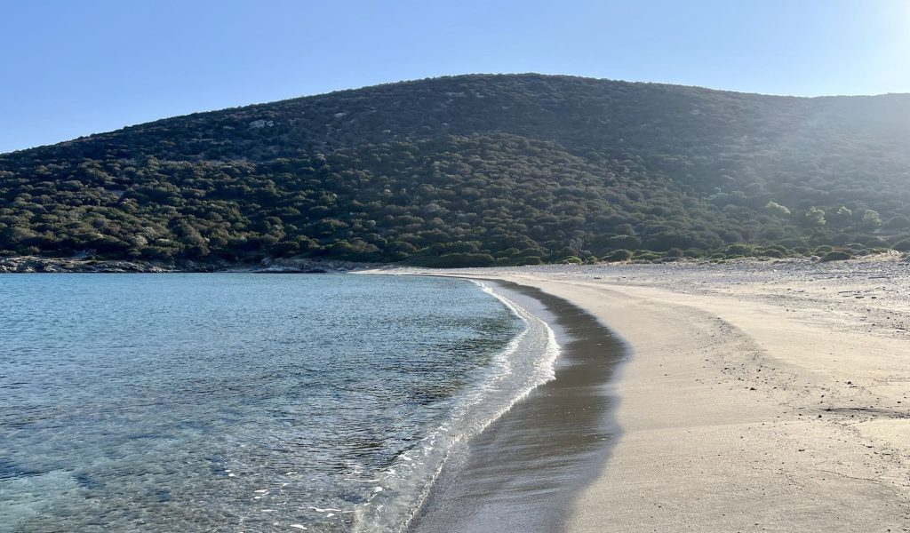 Ich beschließe, mich am Tag darauf weiter in Richtung Norden aufzumachen, alles entlang der Küste von Euböa. Nachdem es kontinuierlich stark weht und es so auch die nächsten Tage bleiben soll plane ich mich in die mit den Freunden am Vortag besuchte Bucht zu legen und auf besseres Wetter zu warten. Der kurze Schlag ist schnell gemacht. Ich habe gelernt und zweifach gerefft, aber natürlich sehe ich wieder 28 Knoten Wind mit entsprechender Welle. Die Bucht aber ist phänomenal. Sandstrand, türkisfarbenes Wasser, wie aus dem Bilderbuch.
