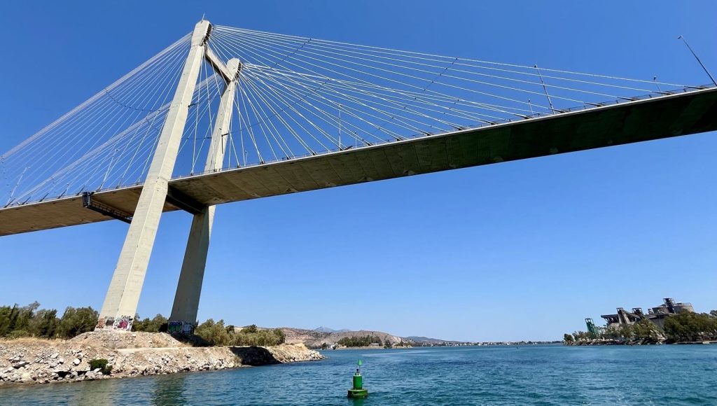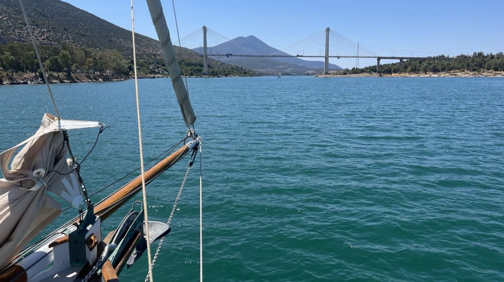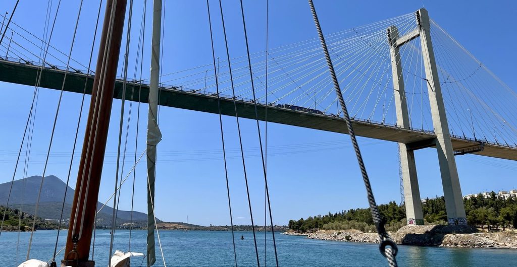 Und dann erscheint die neue Brücke von Chalkida oder Chalkis, wie die Stadt früher mal auf griechisch hieß. Seit 1993 gibt es diese zweite, moderne Straßenverbindung zwischen dem griechischen Festland und der Insel Euböa. Bei einer lichten Höhe von 36 Metern passe ich zweimal unten durch.