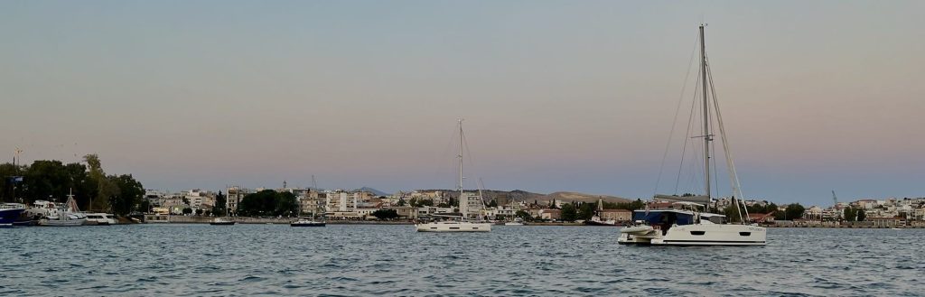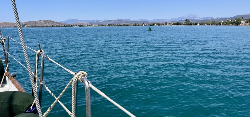 Der Schlag ist kurz, nur etwa 12 Seemeilen weit. Bereits einige Seemeilen vor Chalkida ist das Fahrwasser betonnt: Rote und grüne Bojen markieren den Weg zur Stadt, der sich durch die vorgelagerten Buchten hindurchschlängelt.