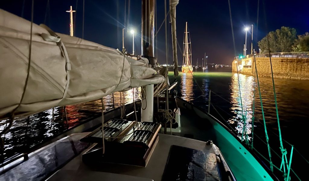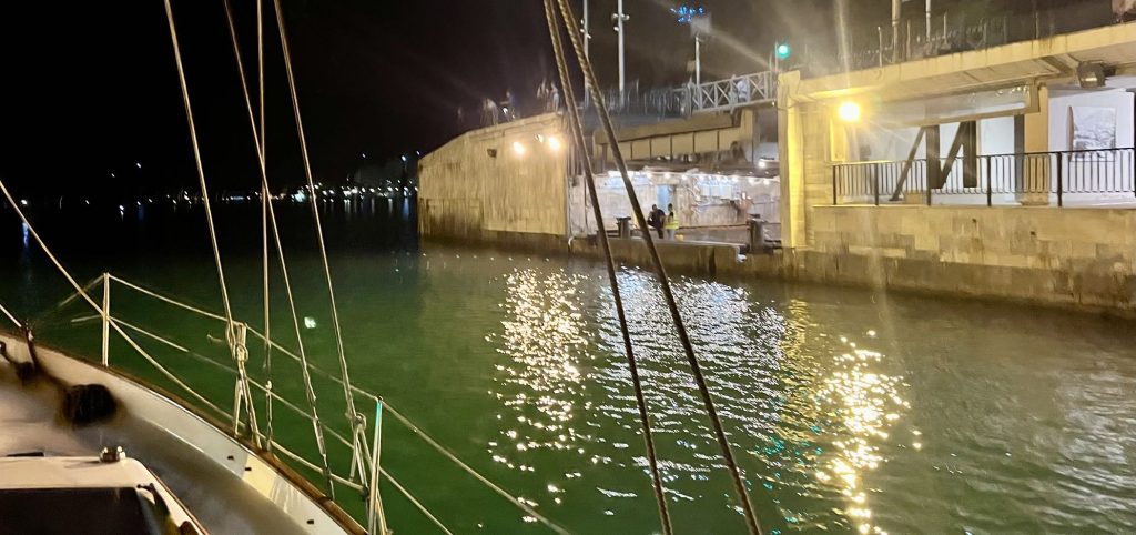 Erst um sage und schreibe 2 Uhr in der Früh geht es los. Der Hafenmeister ruft Schiff um Schiff namentlich auf, kündigt an, dass es bald los geht und bittet die Kapitäne sich bereits zu machen. Rundherum gehen die Lichter auf den Booten an, Motore werden gestartet, Ankerketten rasseln. Dann wird das erste Berufsschiff aufgerufen, das auch als Erstes die Engstelle mit der inzwischen eingezogenen Brücke passiert. Dann das zweite Berufsschiff. Und dann funkt der Hafenmeister, dass sich der ganze Rest der Flotte bitteschön selbstständig auf die Durchfahrt machen soll, also nichts von wegen persönlichem Aufruf! Irgendwie reiht sich nun also ein Boot selbstorganisiert hinter das nächste, und so tuckert die Armada – es sind bestimmt um die 20 Boote – im Gänsemarsch durch die beleuchtete Engstelle. Strömung merke ich keine, man scheint Stauwasser abgewartet zu haben.