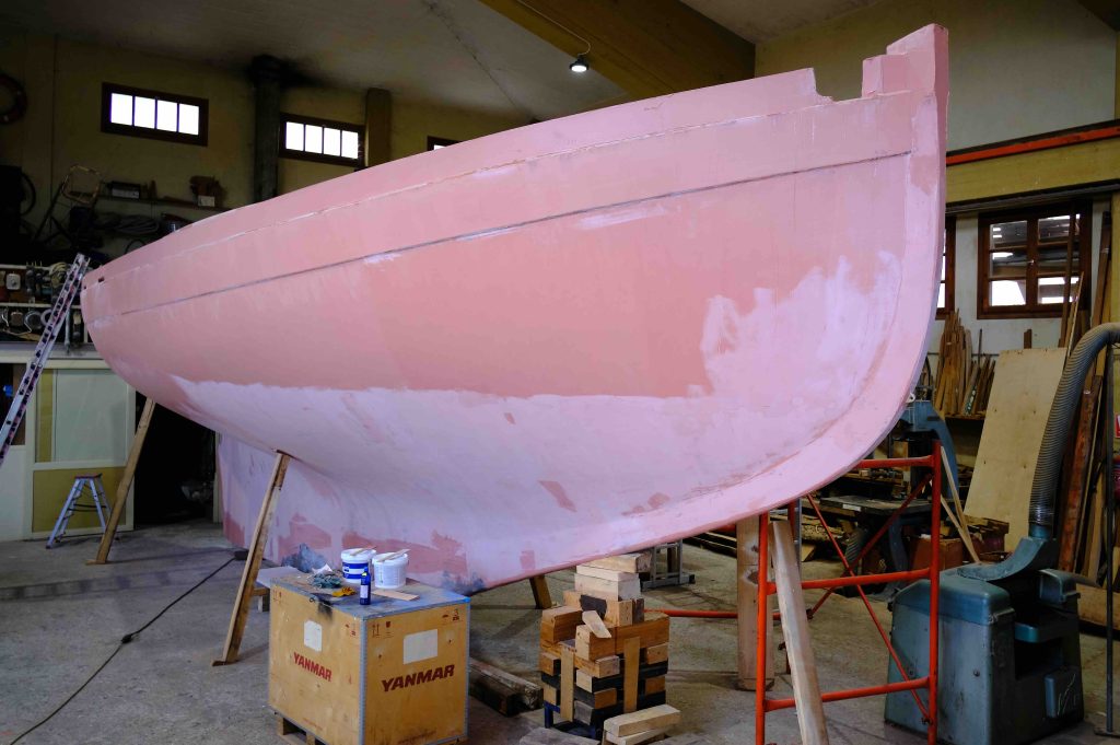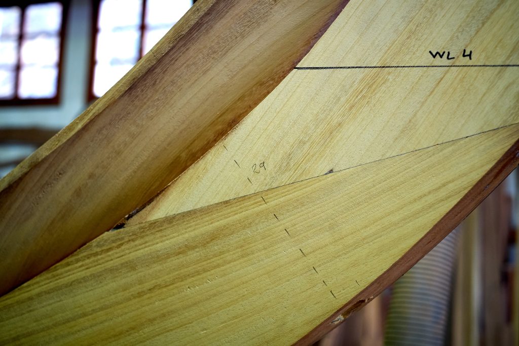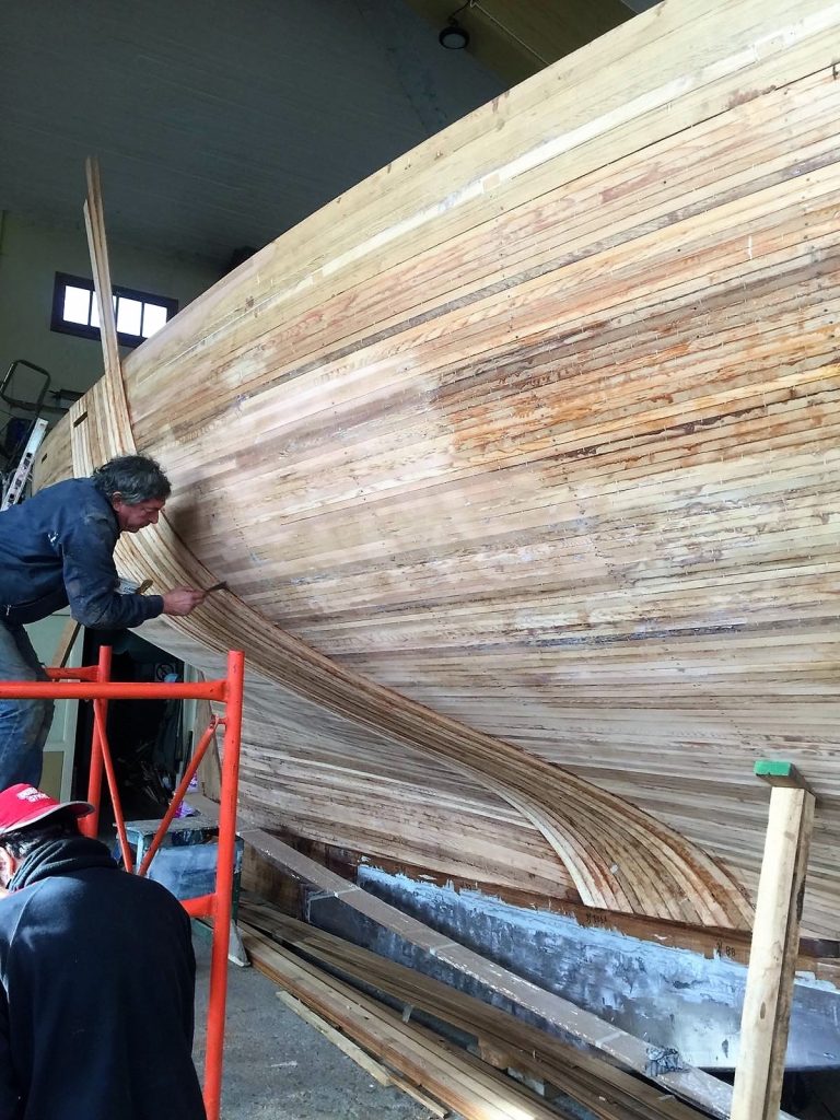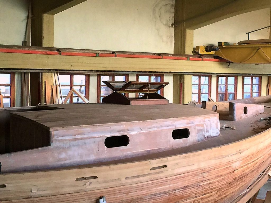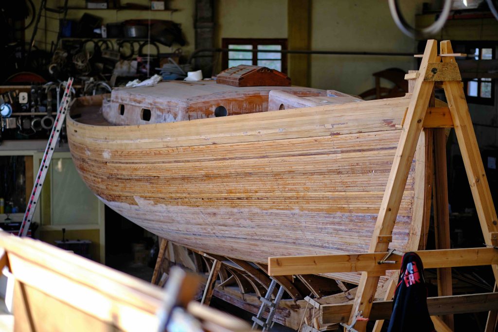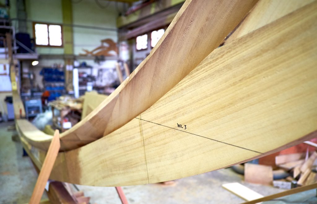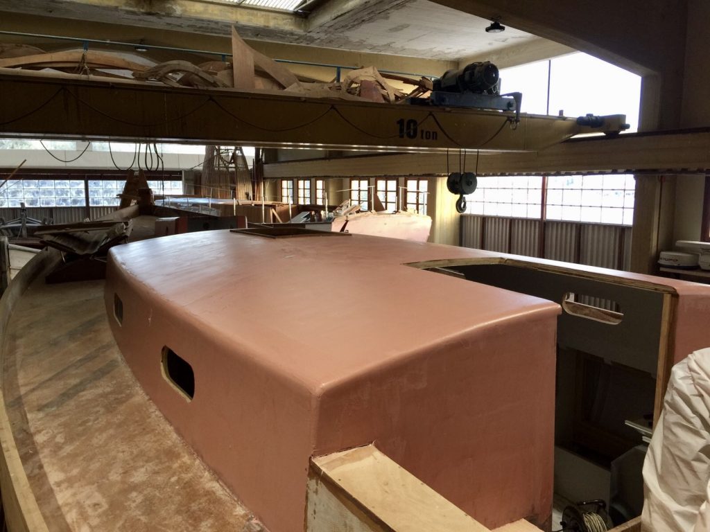 Jetzt kann bezogen werden. Um ein trockenes, pflegeleichtes Boot zu erhalten werden Rumpf, Spiegel und Deck in mehreren Schichten kreuzweise aufgeleimt: Cold molded sagt der Bootsbauer dazu, eine Orgie in Zederstreifen und Epoxy.