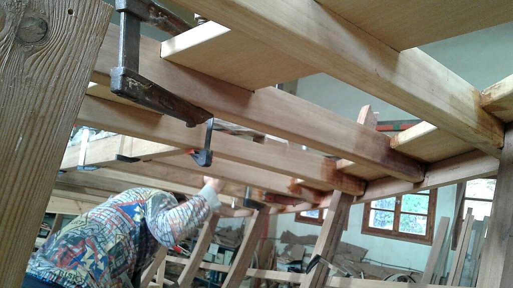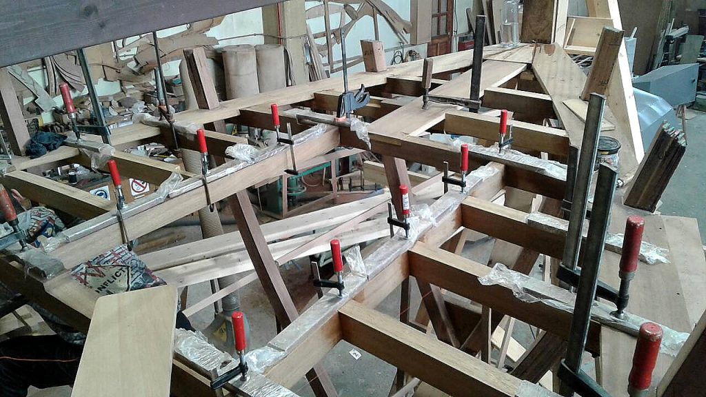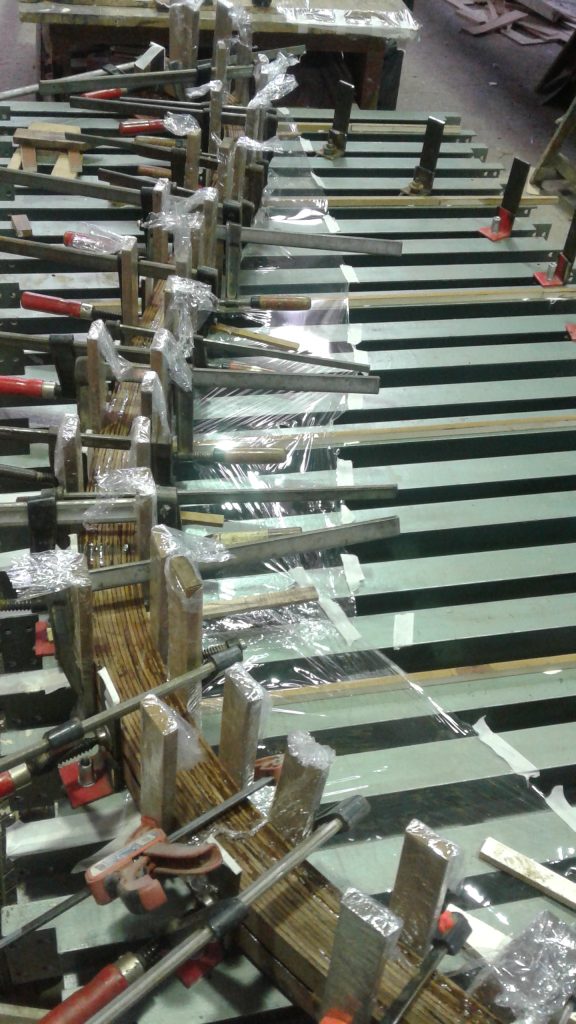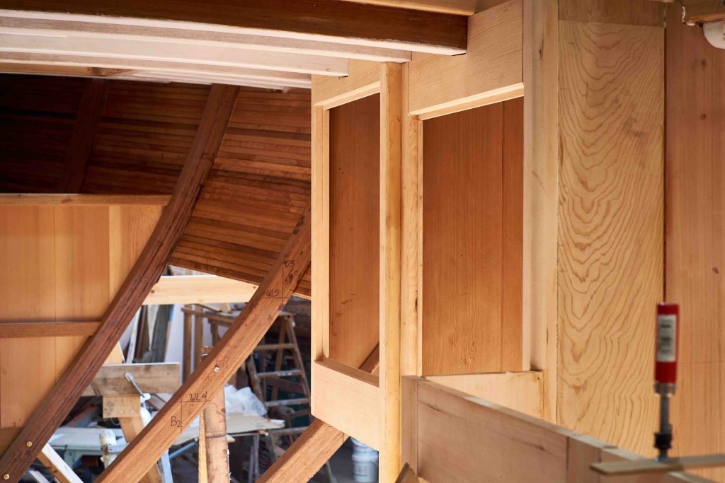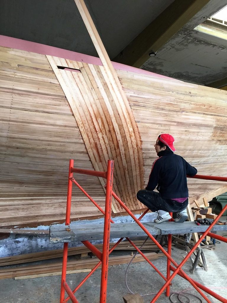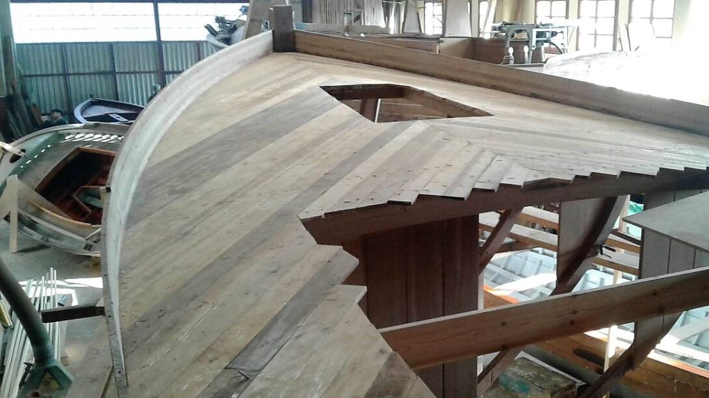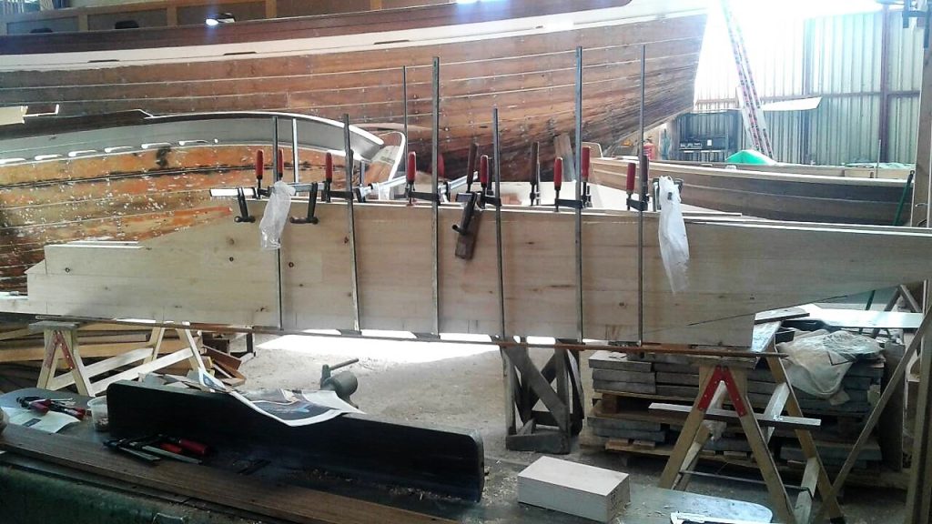 Jetzt kann bezogen werden. Um ein trockenes, pflegeleichtes Boot zu erhalten werden Rumpf, Spiegel und Deck in mehreren Schichten kreuzweise aufgeleimt: Cold molded sagt der Bootsbauer dazu, eine Orgie in Zederstreifen und Epoxy.