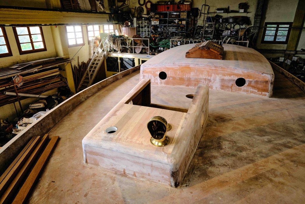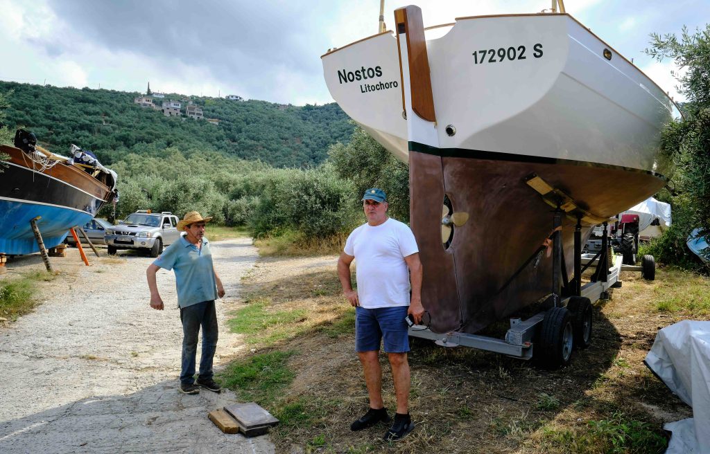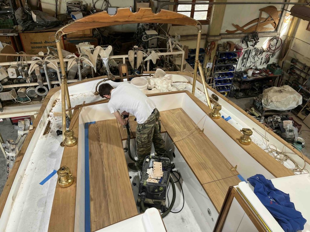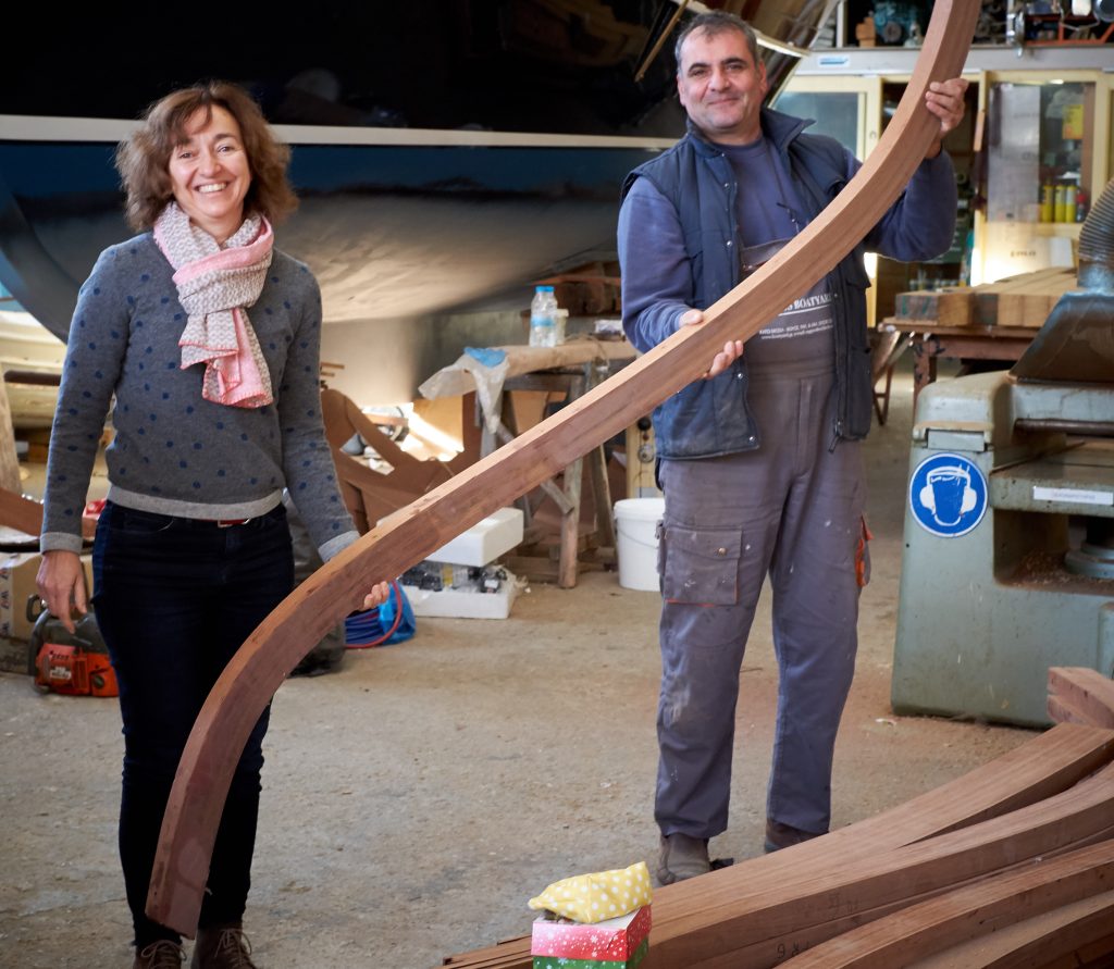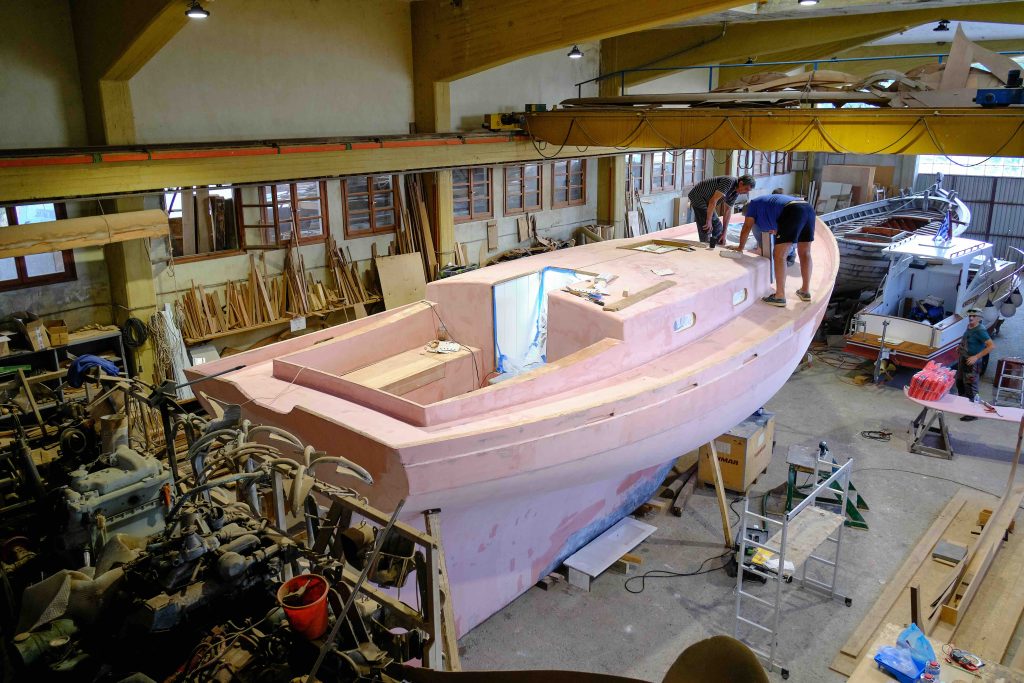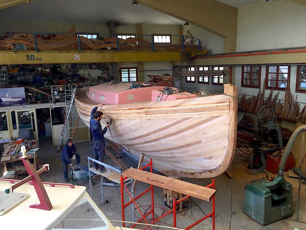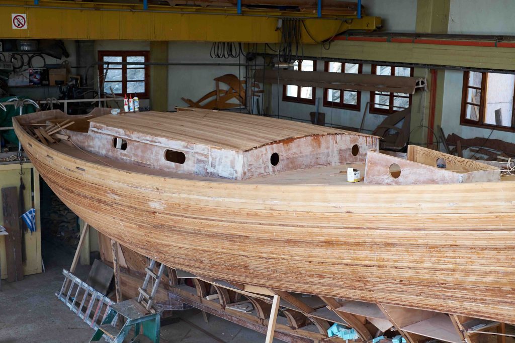 Gebaut worden ist das Boot dann in Griechenland in der Bootswerft Reppos in der Nähe von Volos – aus Iroko für Kiel, Spanten und Balken, und western red cedar für den Rumpf: