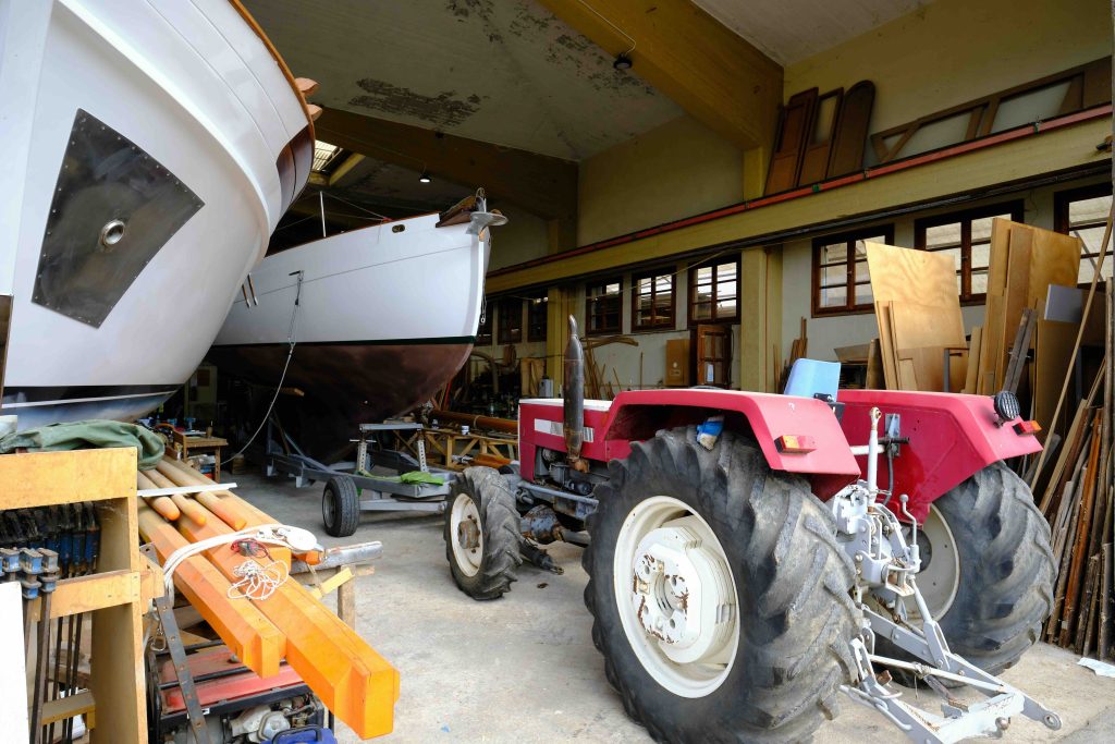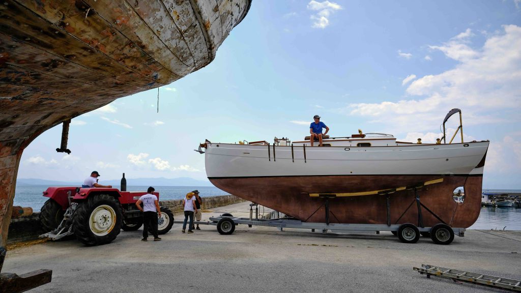Der Traktor zieht das Boot aus der Werft, in der es sieben lange Jahre auf diesen Tag gewartet hat: